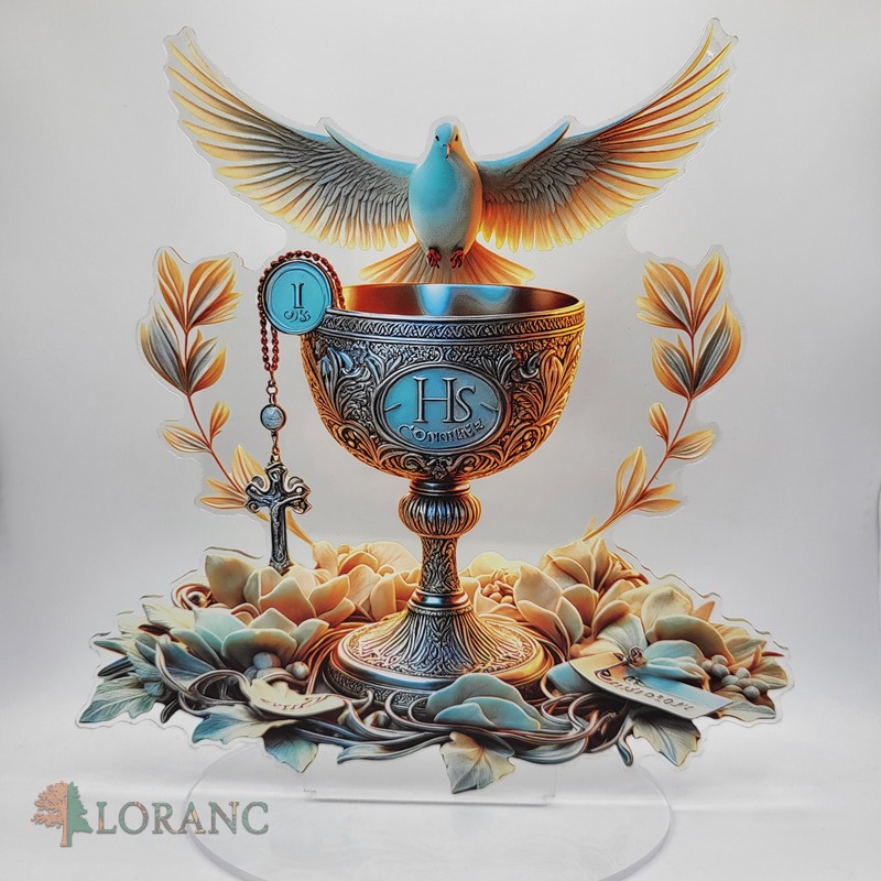 Elegantná akrylová stojaca dekorácia s motívom prvého svätého prijímania je nádherným doplnkom, ktorý dodá sviatočnej výzdobe výnimočný a duchovný charakter. Vysoko kvalitný číry akryl zabezpečuje stabilitu a luxusný vzhľad, zatiaľ čo detailná potlač kalicha s IHS, holubice a jemných listov vytvára harmonickú a pôsobivú kompozíciu.