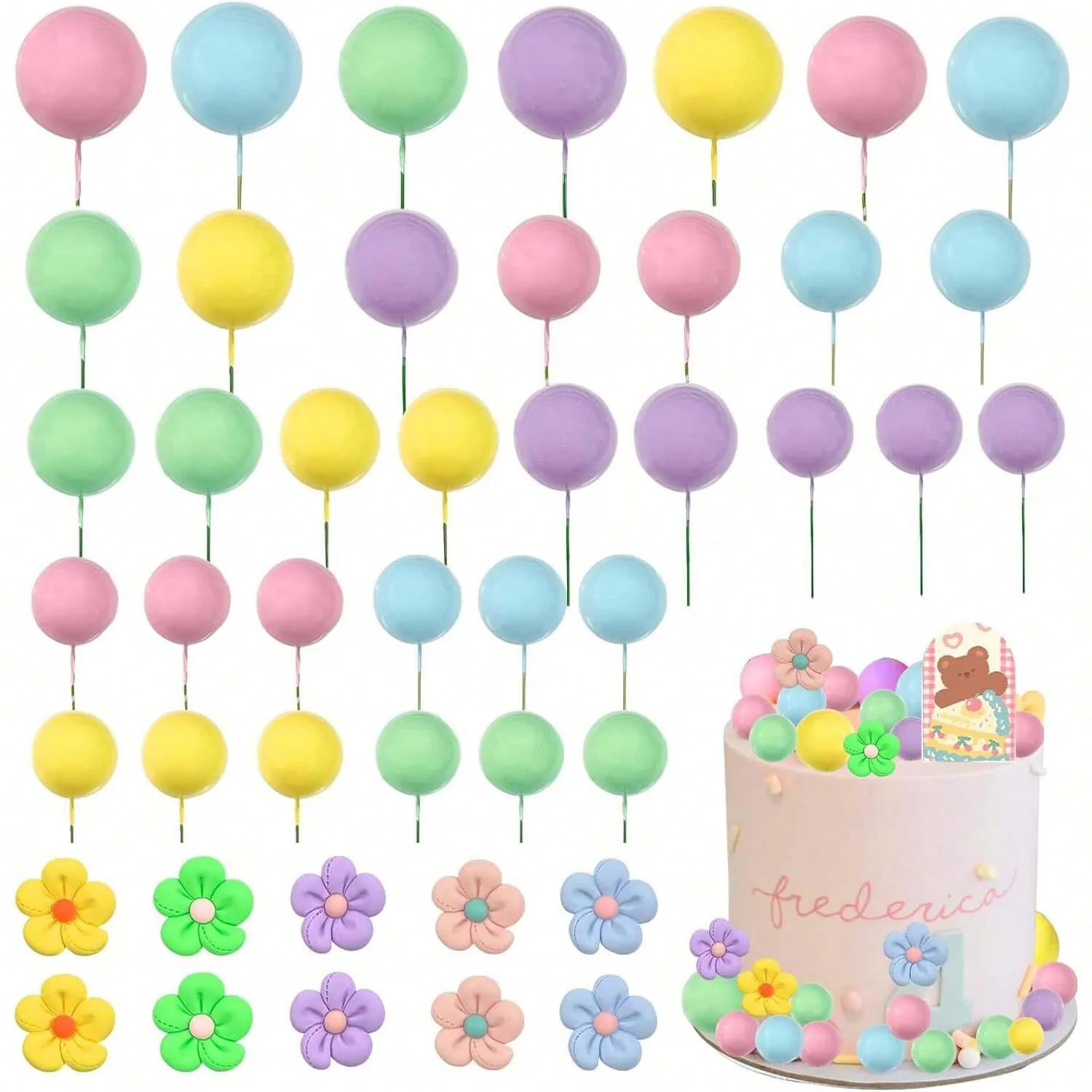 1 balenie = 35 ks guličiek /2-2,5-3-4 cm x 5 farieb / + 10 ks kvietok + 1 tabuľka /dokresliť podľa vlastnej fantázie/