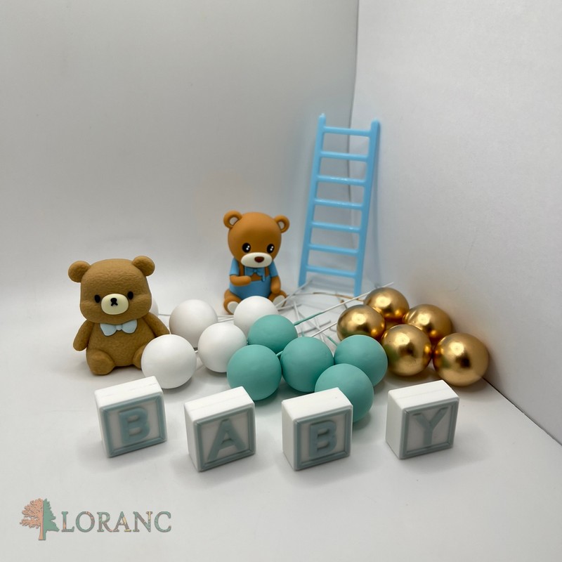 Dekorácia na tortu – 15 ks guličiek + 2 ks macko + kocky BABY + rebrík