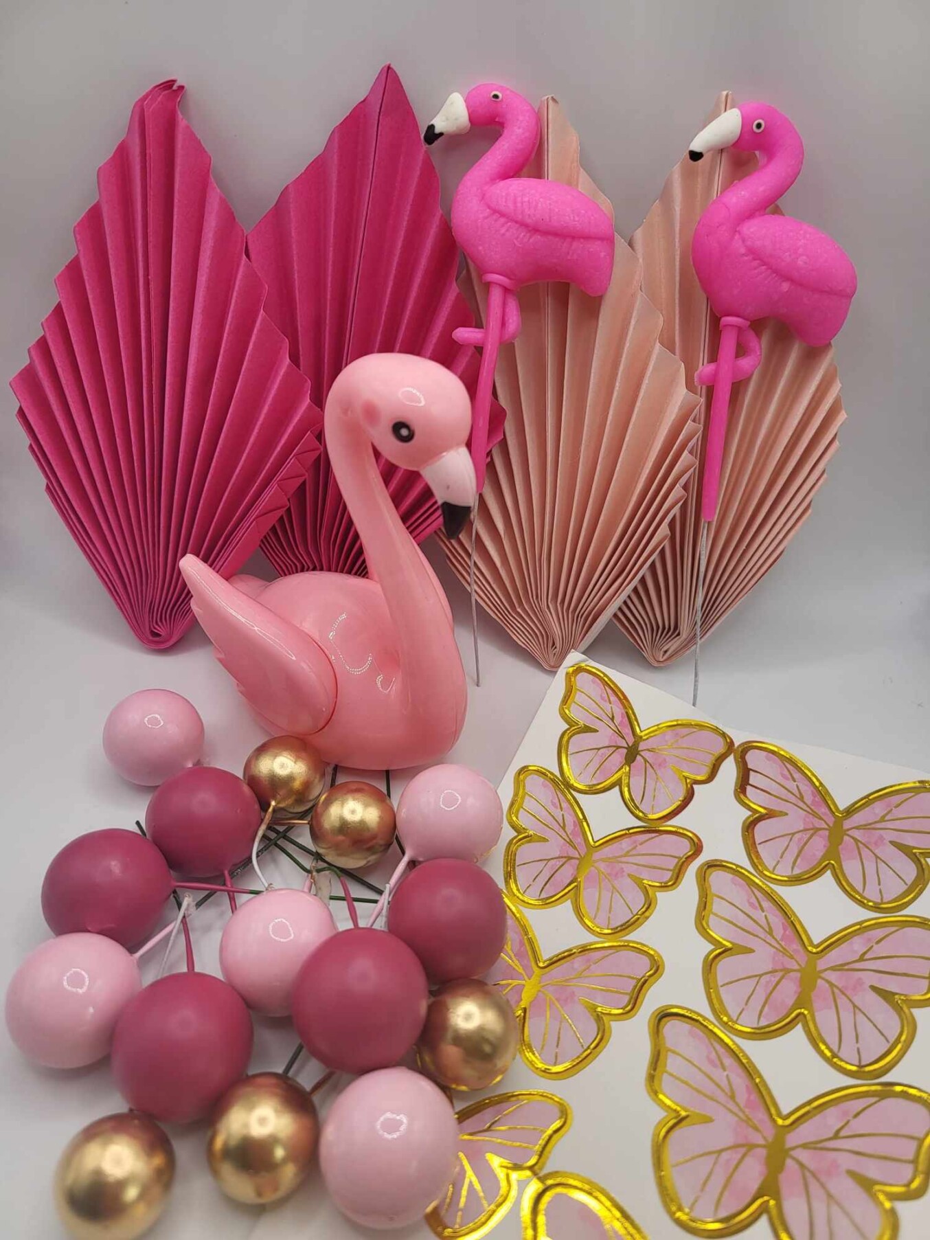 15 ks guličiek /3 farby/ +4 ks palmový list + 11 ks papierových motýľov + 1 plameniak /postavička/ + 2 x plameniak zápich
