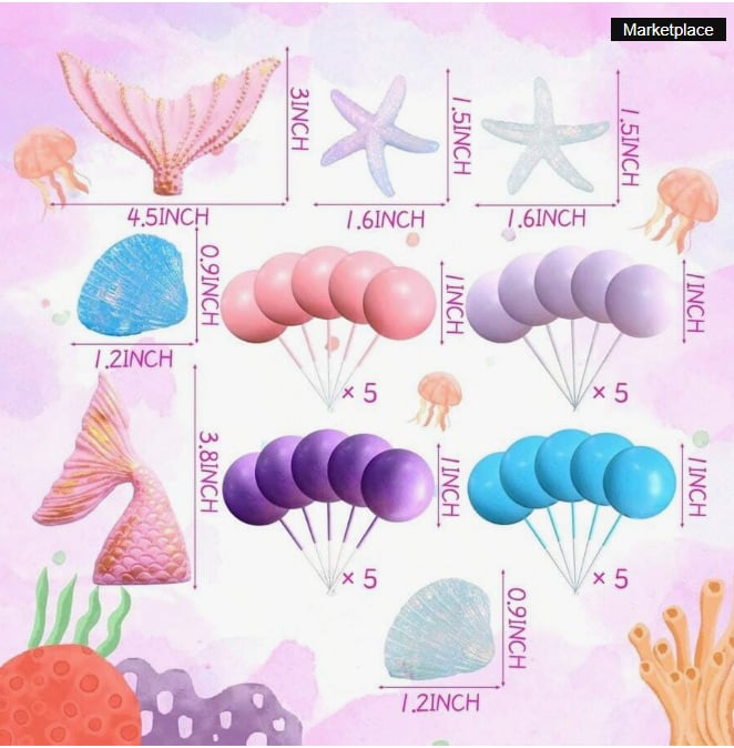 Dekorácie sú vyrobené z pevného plastu, majú jemné pastelové farby a lesklý efekt. Sada obsahuje plastové chvosty morskej panny, guličky na zápich, ako aj dekorácie v tvare mušlí a hviezdice. Vhodné na zapichnutie do torty, cupcakes alebo na dozdobenie sladkého stola. Po oslave sú dekorácie opakovane použiteľné.
