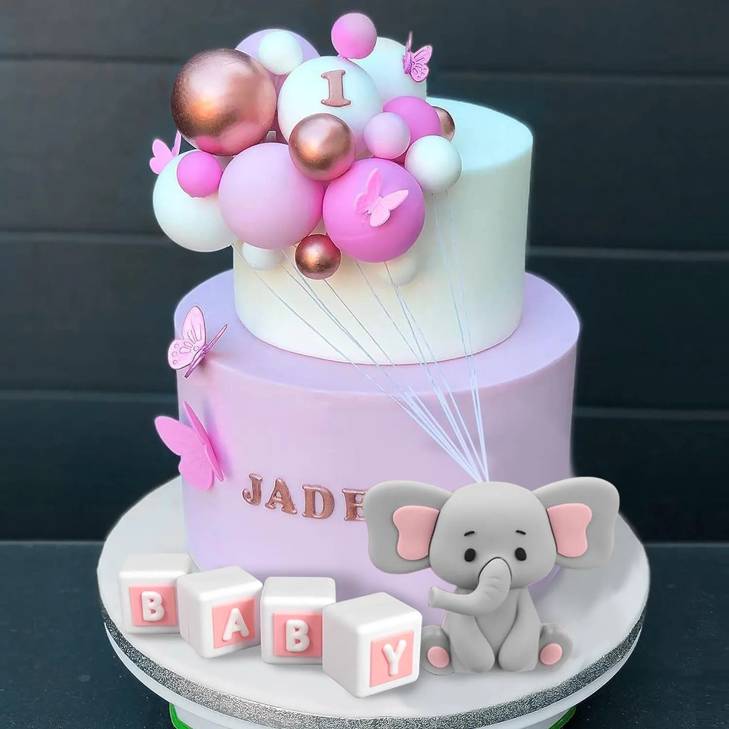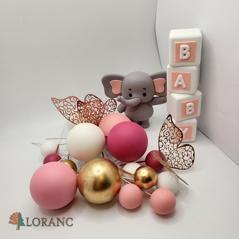Dekorácia na tortu – 17 ks guličky/2 cm a 4 cm/ + 3 ks motýľ/3 veľkosti/ + 4 kocky + 1 sloník