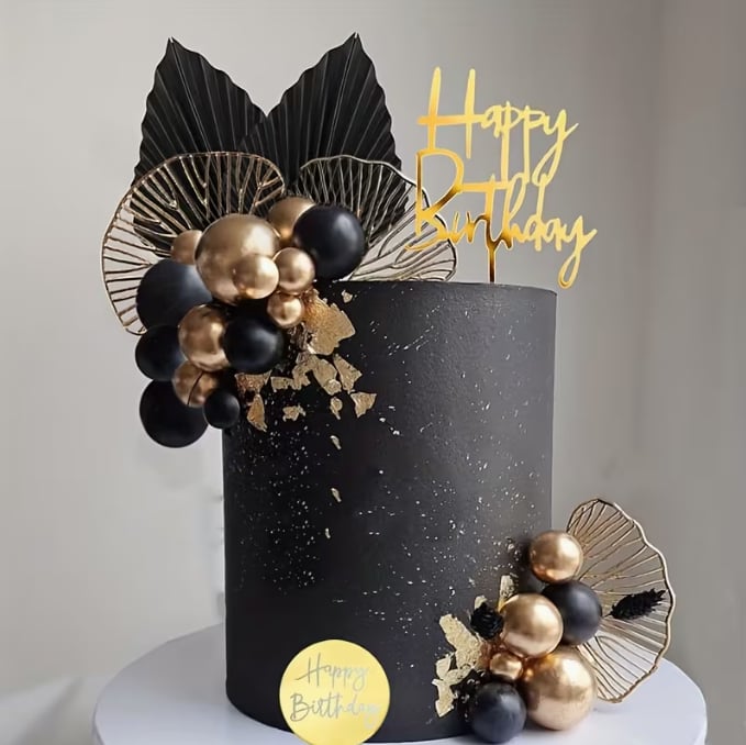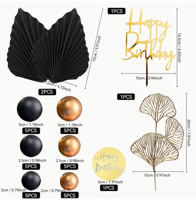 1 balenie = 30 ks guličiek /3 veľkosti a zlatá, čierna farba/ + 2 ks palmový list + 1 ginko list + 2 nápis Happy Birthday