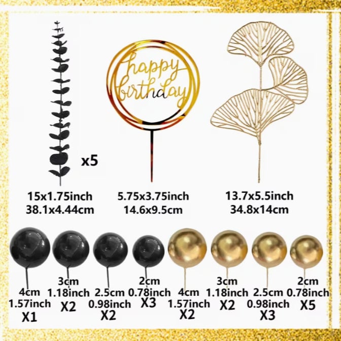 1 balenie = 20 ks guličiek /zlatá, čierna farba/ + 1 ginko list +5 ks čierne lístky/trávy + 1 ks zápich Happy Birthday