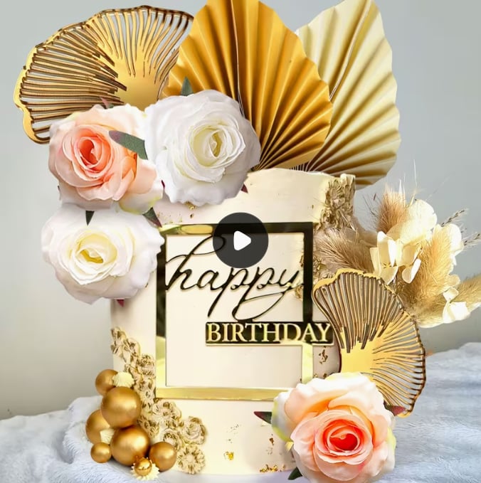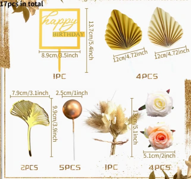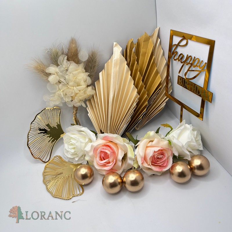 1 balenie = 4 ks kvetov +1 ks tráva s kvietkami + 2 ks zlatý ginko list + 1 ks zápich Happy Birthday + 5 ks zlaté guličky + 4 ks palmový list