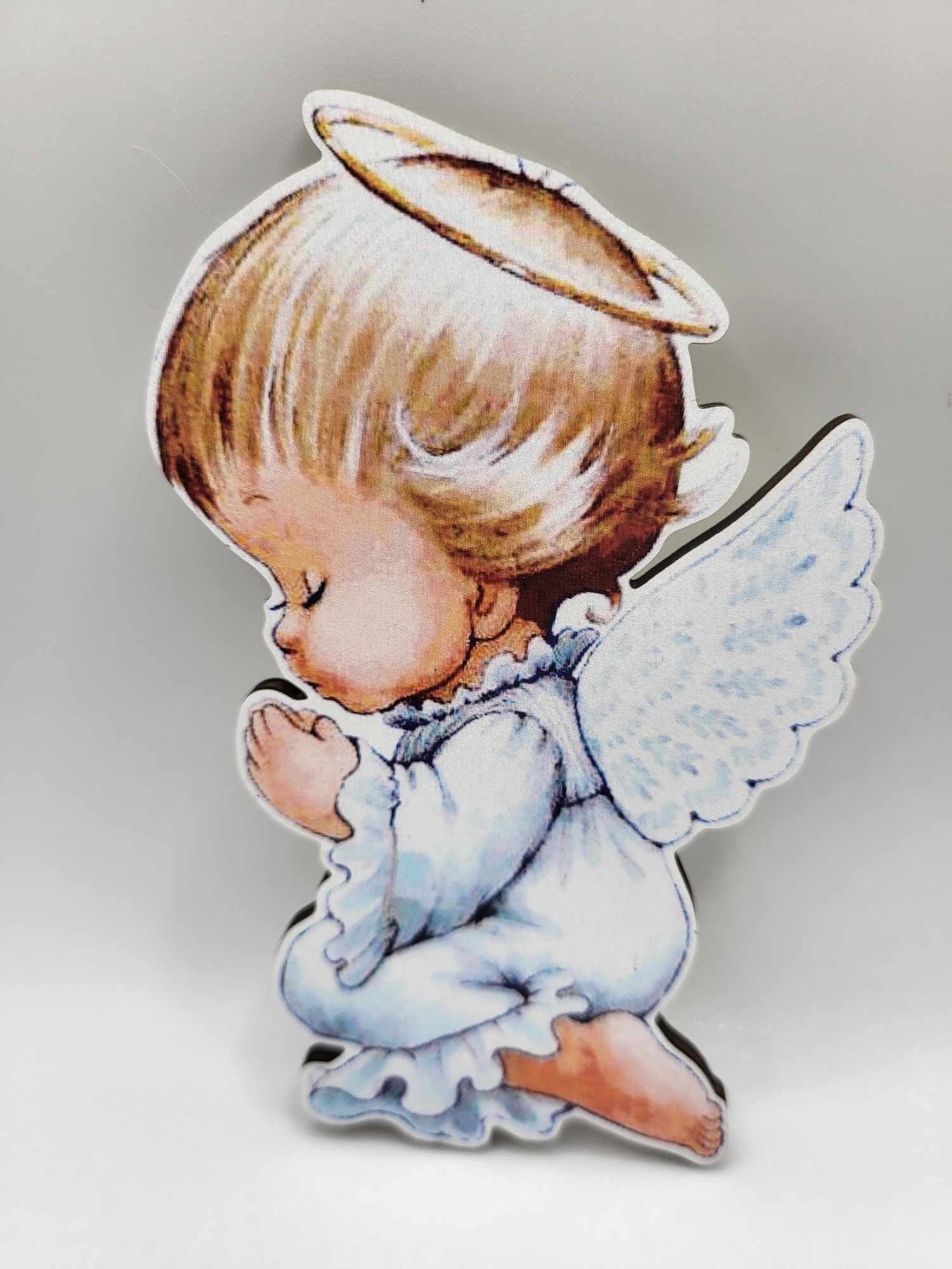 Drevená magnetka s jemným modliacim sa anjelikom je krásna dekorácia a milý darček pre deti aj dospelých. Vďaka precíznemu spracovaniu a kvalitnej potlači je vhodná na chladničku, tabuľu alebo ako ozdoba do detskej izbičky. Tento anjelik sa perfektne hodí aj na krst, prvé sväté prijímanie, narodeniny či akékoľvek duchovné alebo rodinné udalosti.