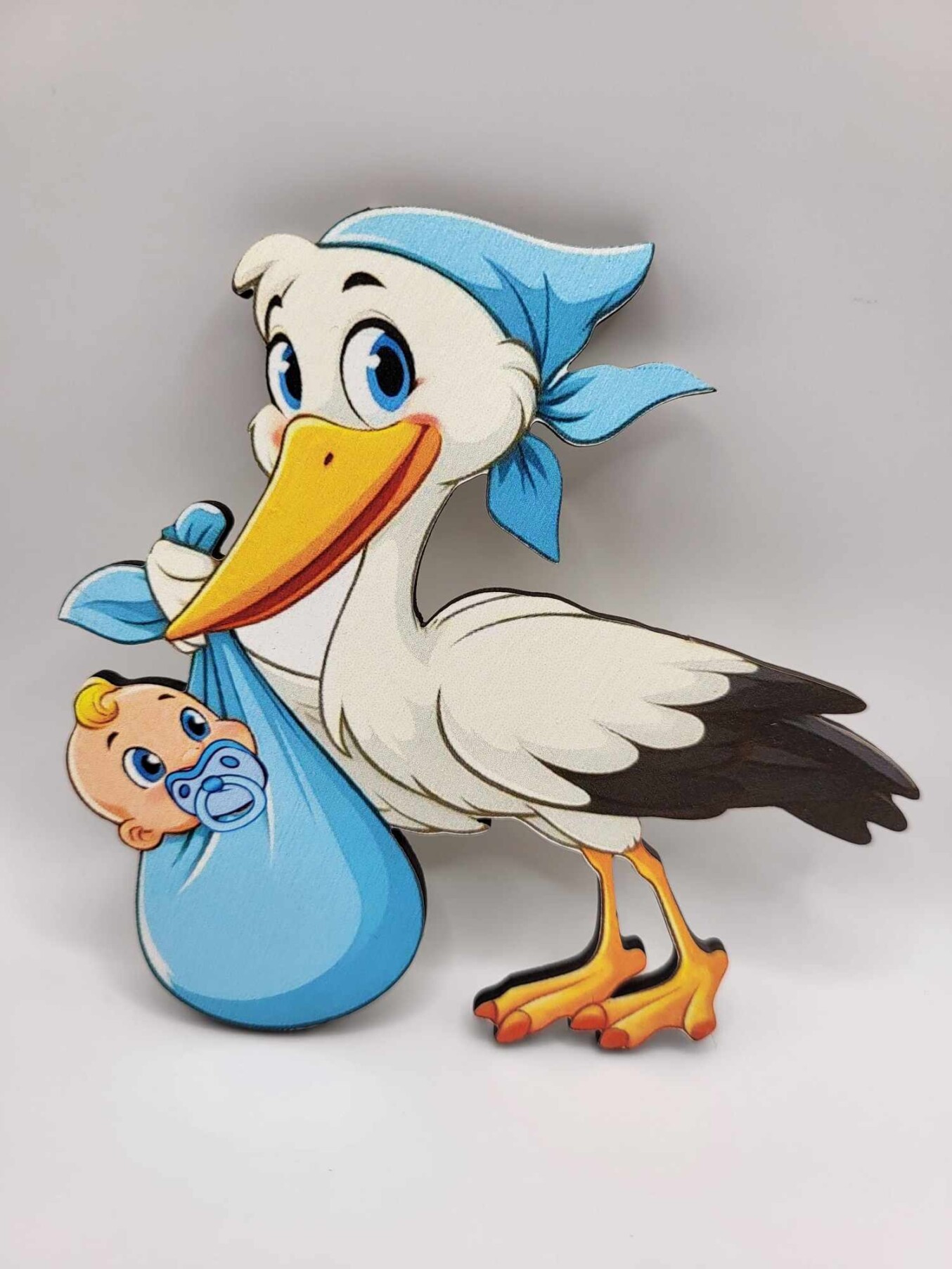 Drevená magnetka – bábätko s bocianom | dekorácia na tortu / zápich