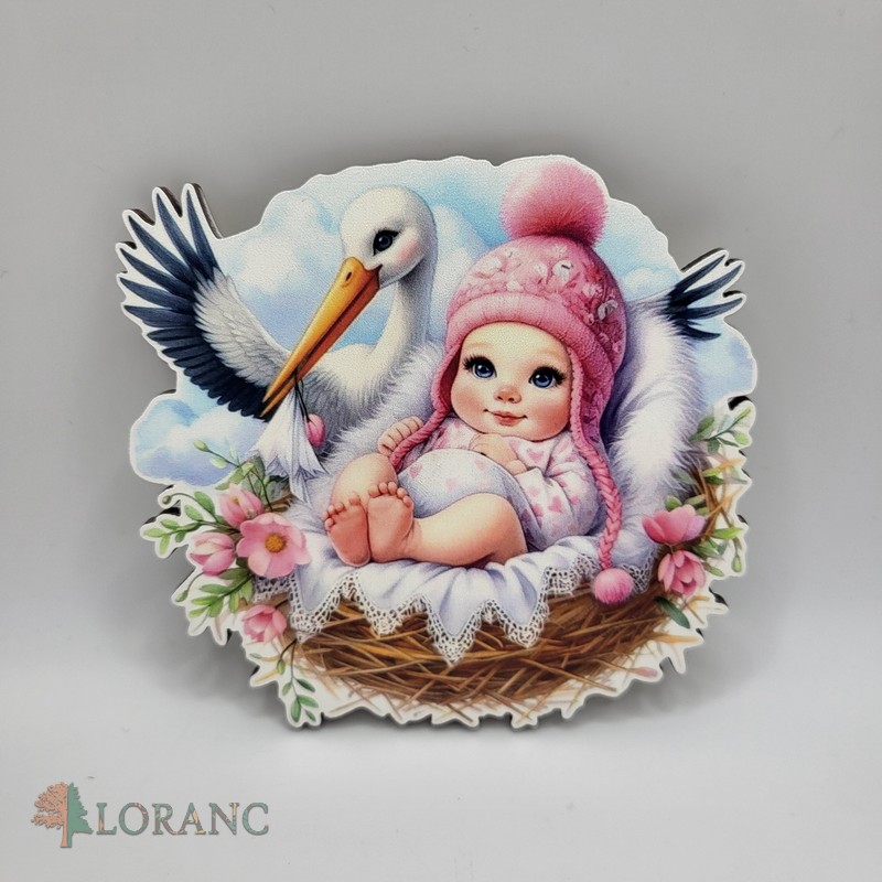 Drevená magnetka – bábätko s bocianom | dekorácia na tortu / zápich
