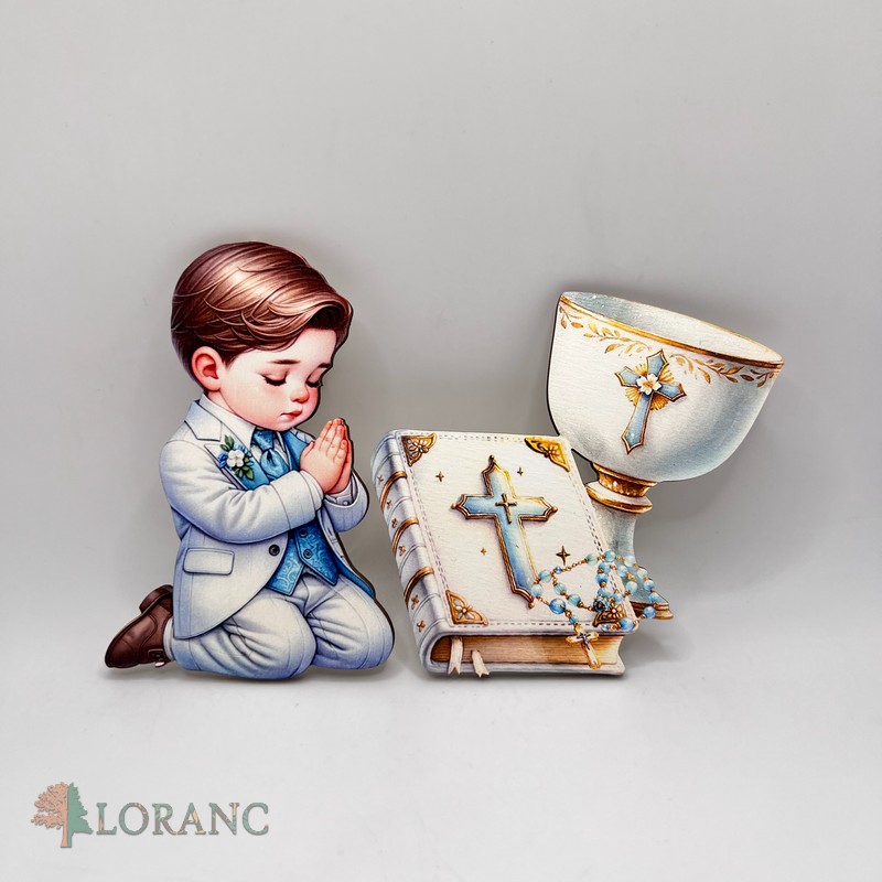 Kľúčové slová: drevená magnetka, modliaci sa chlapček, zápich na tortu, dekorácia na tortu, dekorácia na čelo torty, prvé sväté prijímanie, birmovka, konfirmácia, kresťanský darček, darček pre chlapca, kalich, biblia, ruženec