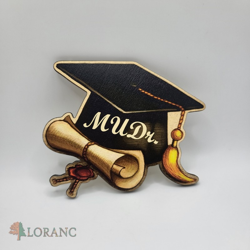 Magnetka je vyrobená z kvalitného dreva a detailne spracovaná, čo jej dodáva luxusný a zároveň prirodzený vzhľad. Hodí sa ako dekorácia na chladničku, milý darček pre absolventa alebo štýlový doplnok na oslavu promócie.