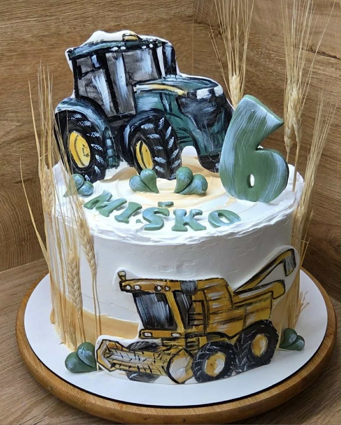 Na fotografii vidíte tortu, kde sú motívy ručne maľované cukrárkou. Ak však maľovanie nie je vaša silná stránka, máme pre vás jednoduchú a krásnu alternatívu – naše drevené magnetky s motívom traktora alebo kombajnu.