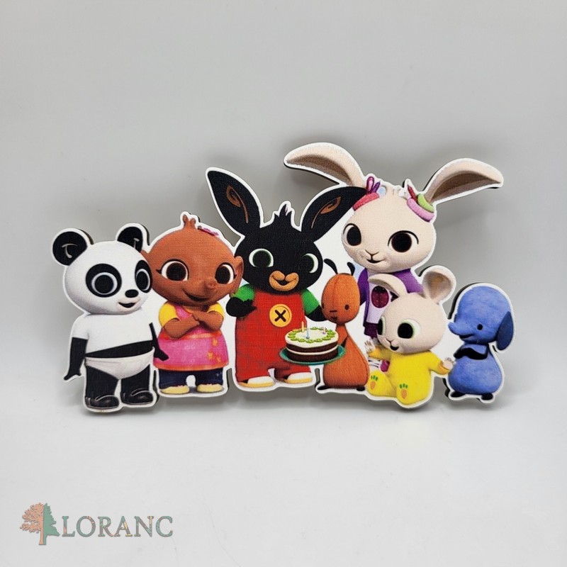 Veselá drevená magnetka s rozprávkovými postavičkami zo seriálu Bing je ideálnou dekoráciou na detské oslavy a narodeninové torty. Magnetka je vyrobená z kvalitnej topoľovej preglejky a spracovaná s dôrazom na detaily, aby zaujala deti aj rodičov.