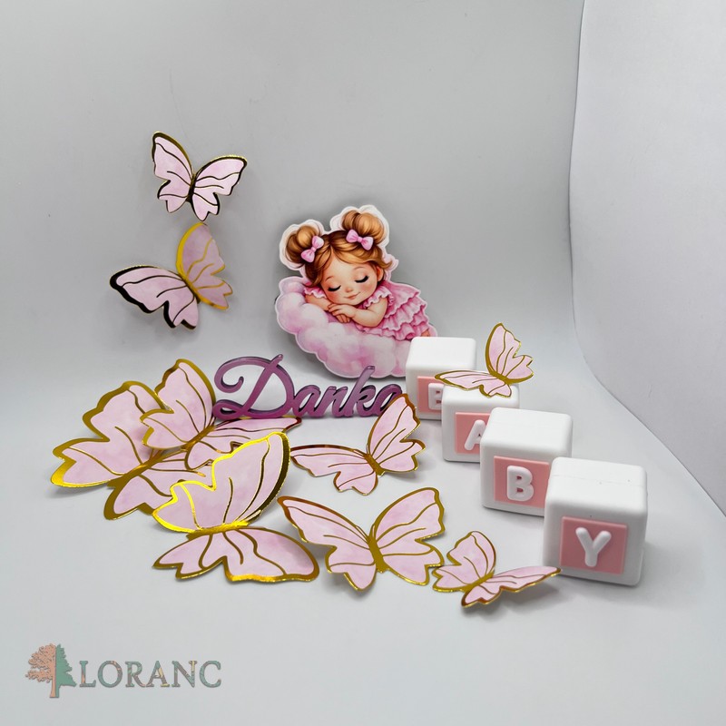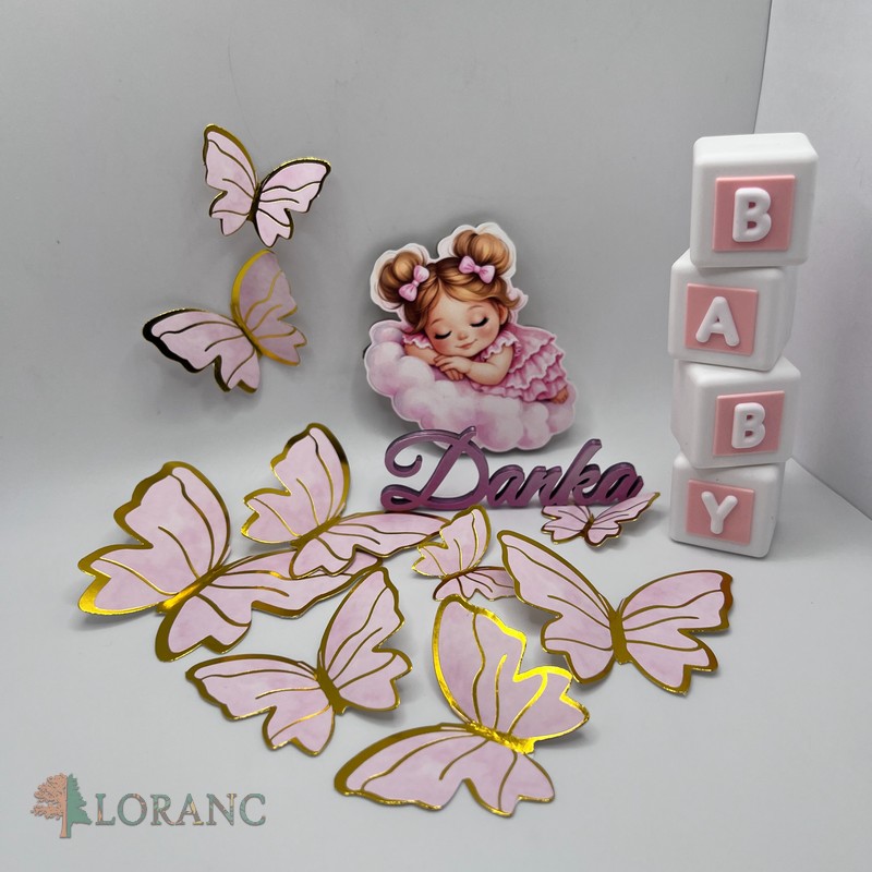 dekorácia na tortu – SADA – magnetka dievčatko na obláčiku + motýle + meno + nápis BABY