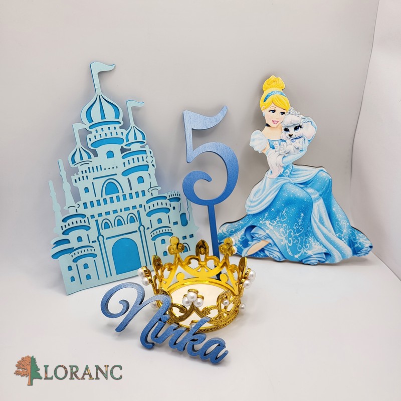 Dekorácia na tortu – magnetka popoluška + meno + číslo + papierový zámok + korunka