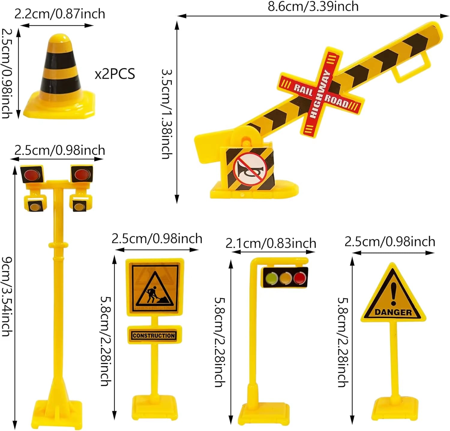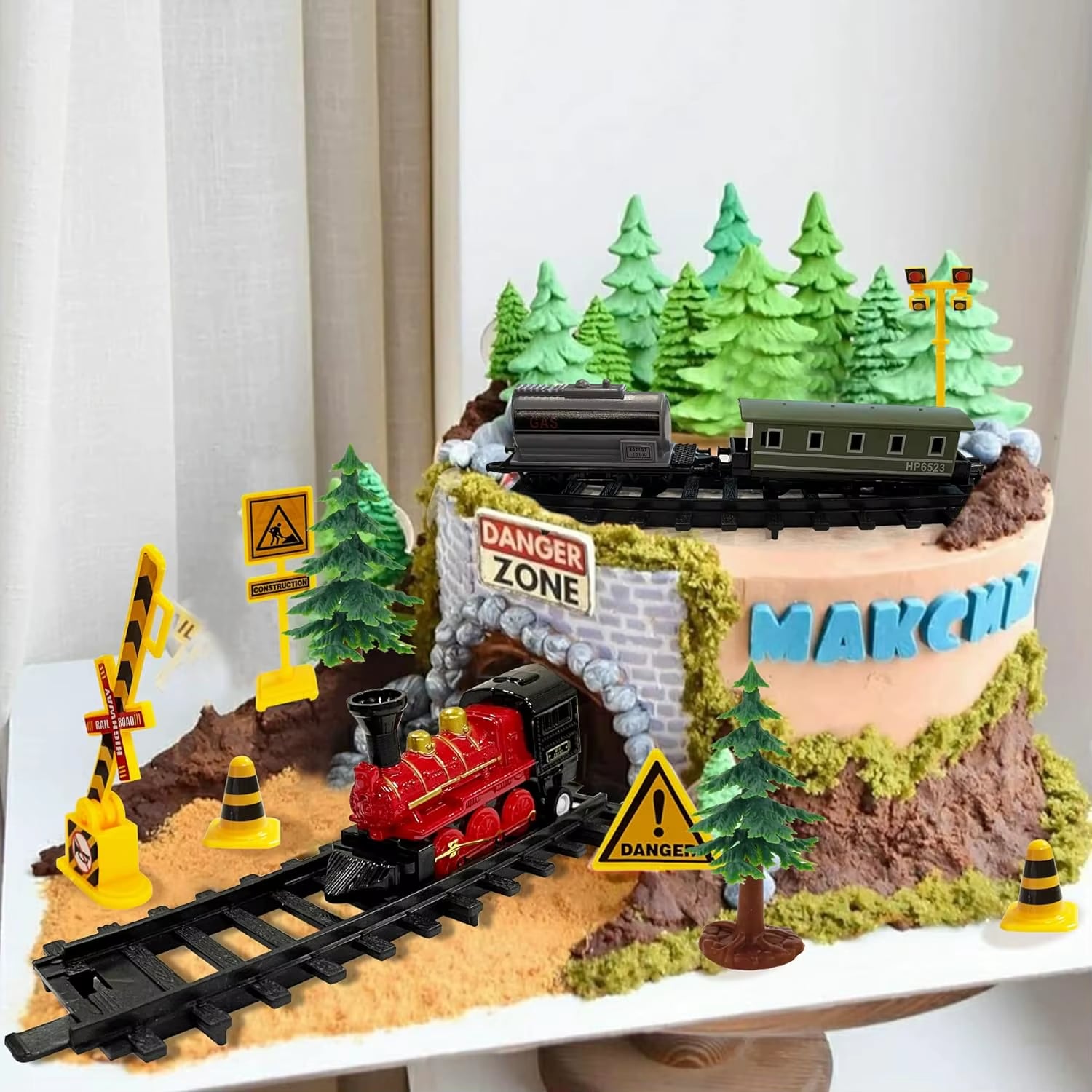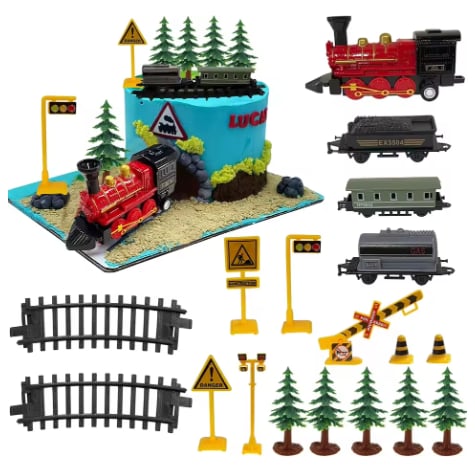 Dekorácia na tortu ktorá obsahuje vláčik, vagóny, koľajnice, dopravné značenie a stromy