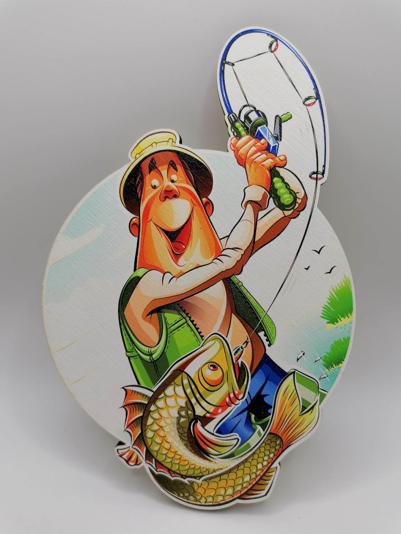 Vtipná drevená magnetka veselý rybár je ideálny darček pre každého milovníka rybárčenia. Skvele poslúži aj ako dekorácia na tortu alebo zápich na tortu.