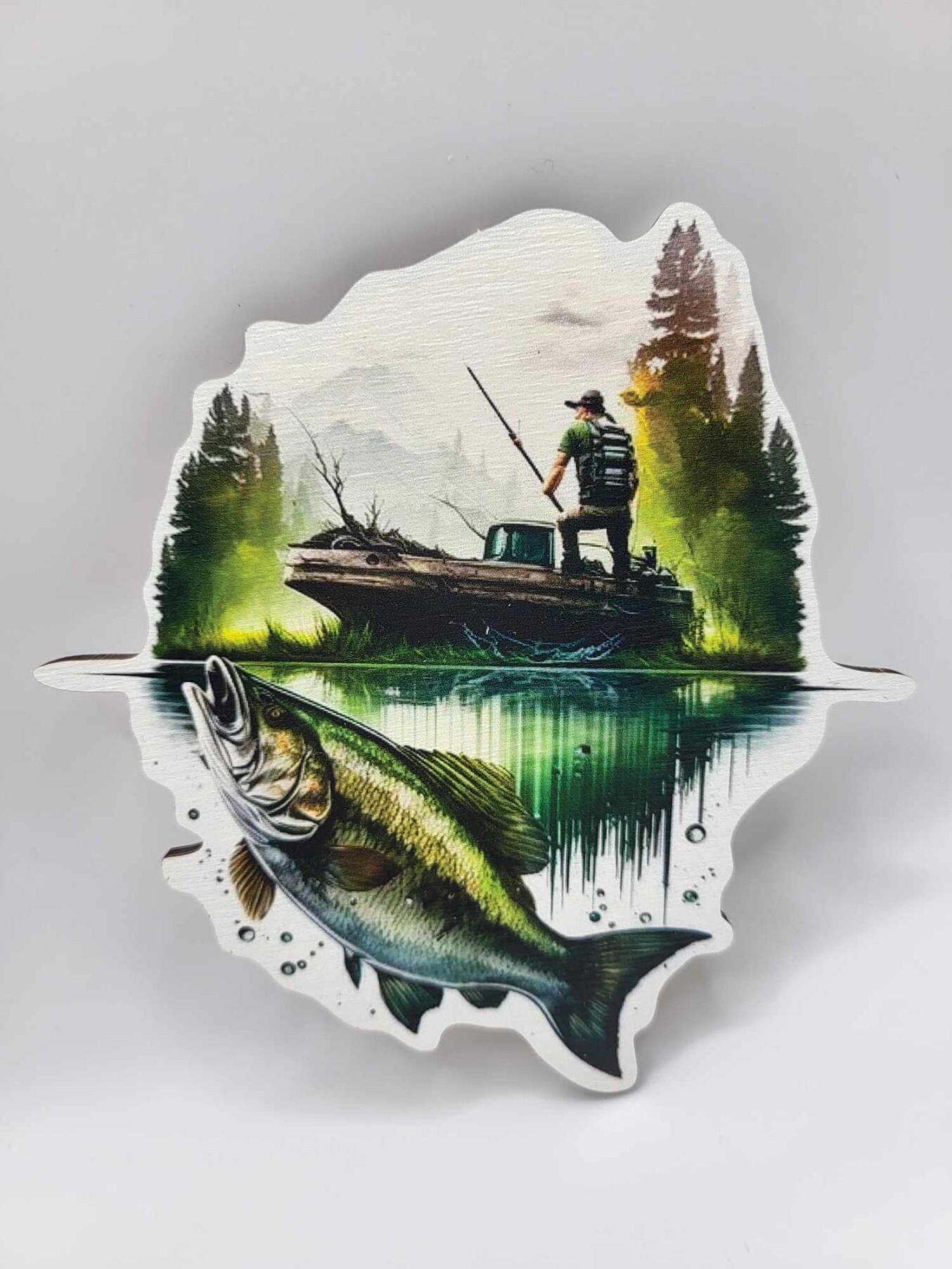 Magnetka je vyrobená z kvalitného dreva a precízne spracovaná, vďaka čomu vynikajú všetky detaily ilustrácie. Je ideálna ako dekorácia na chladničku, darček pre rybára alebo tematický doplnok na oslavu.