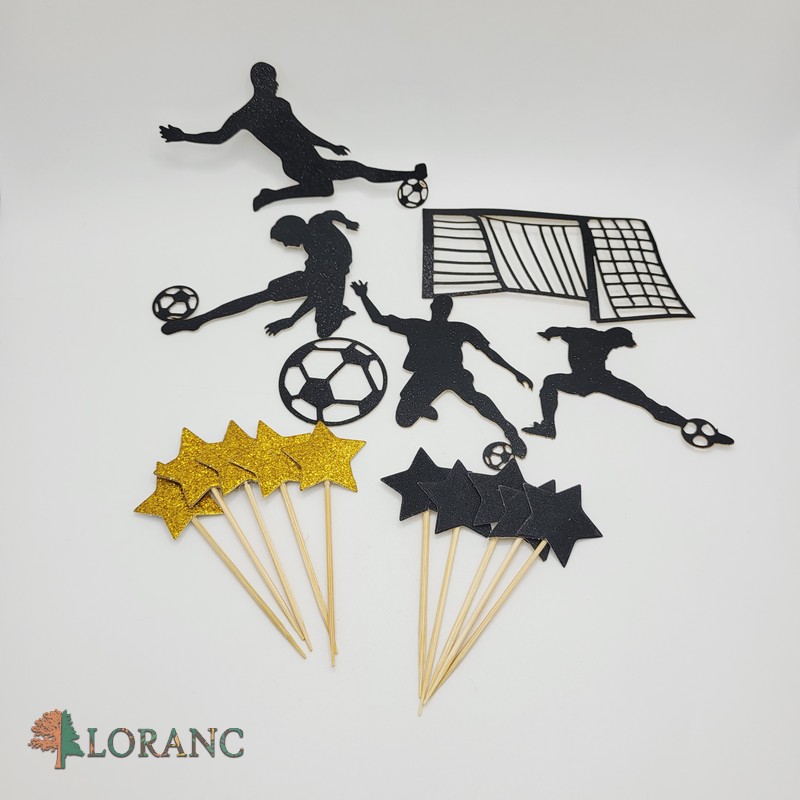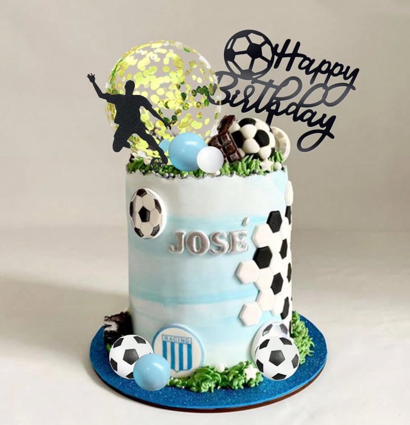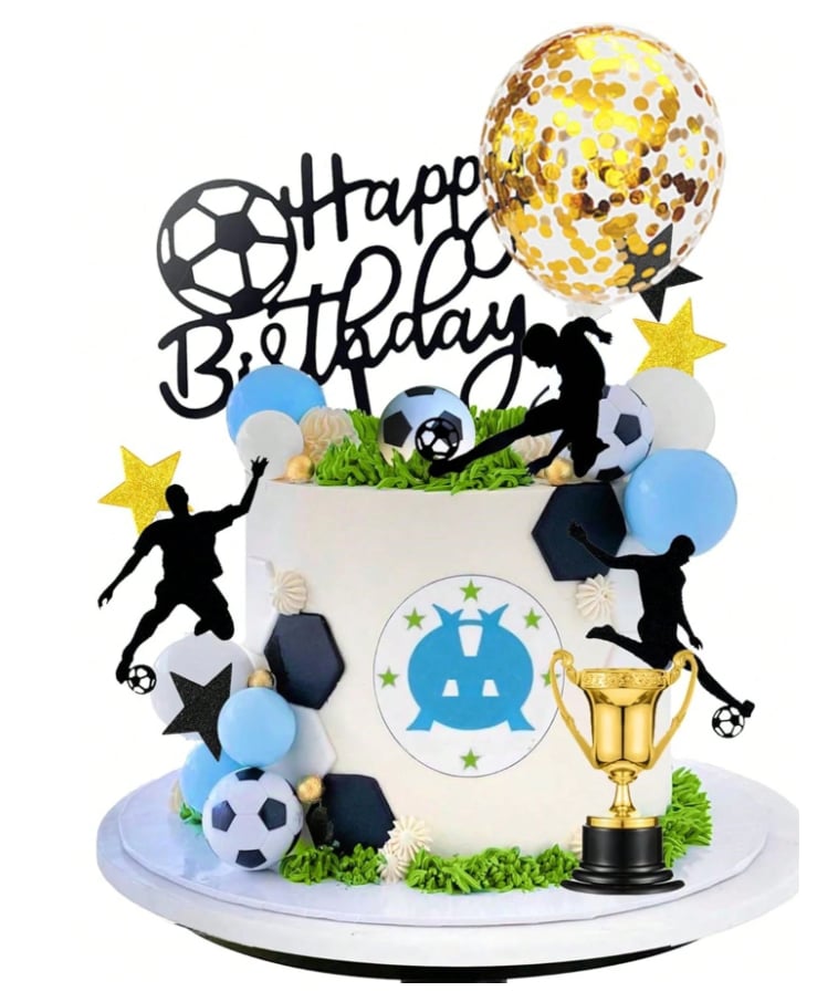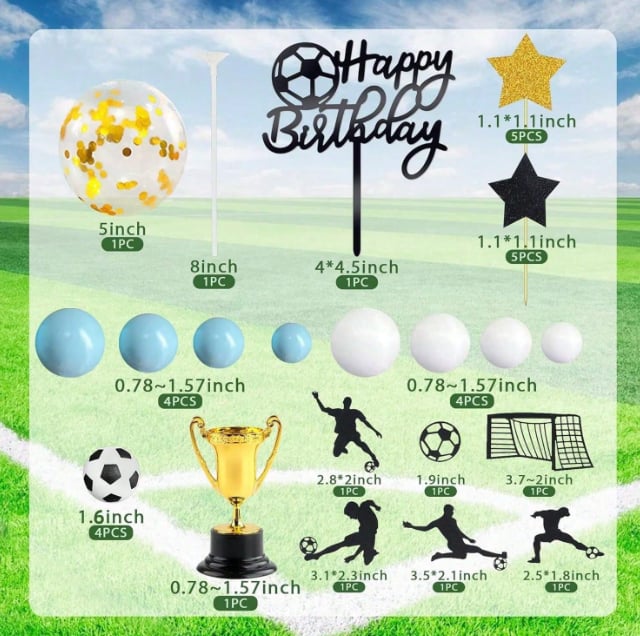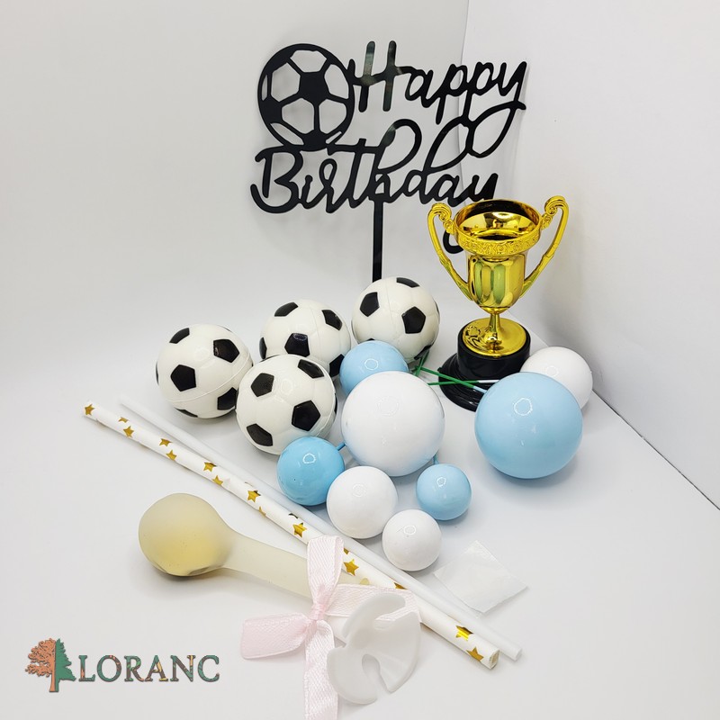 futbalová lopta 4 ks + pohár + zápich Happy Birthday + guličky 8 ks + balón s konfetami vo vnútri + papierové zápichy futbalisti, hviezdy a bránka