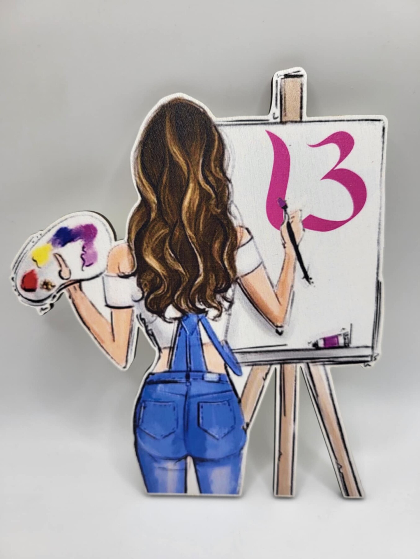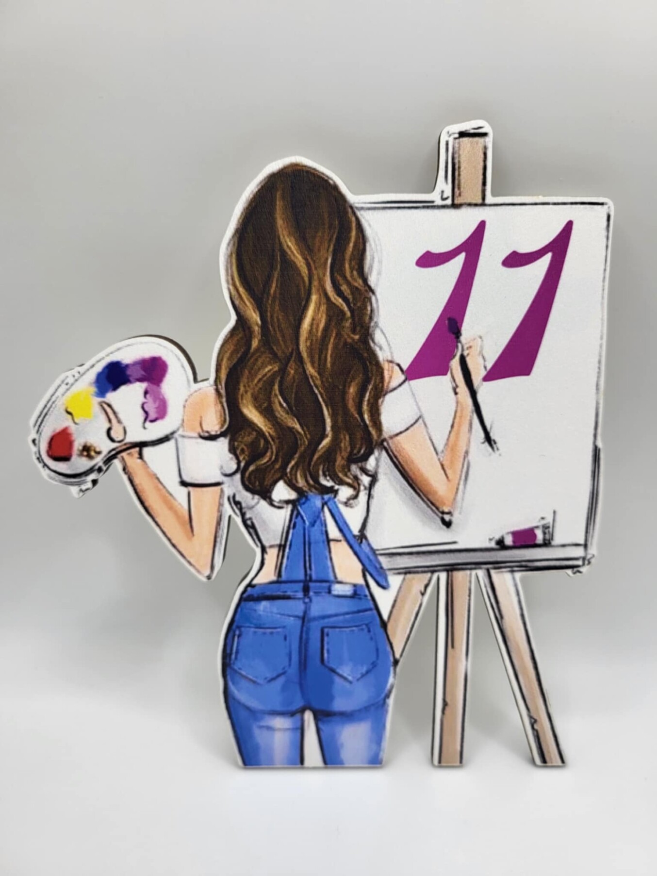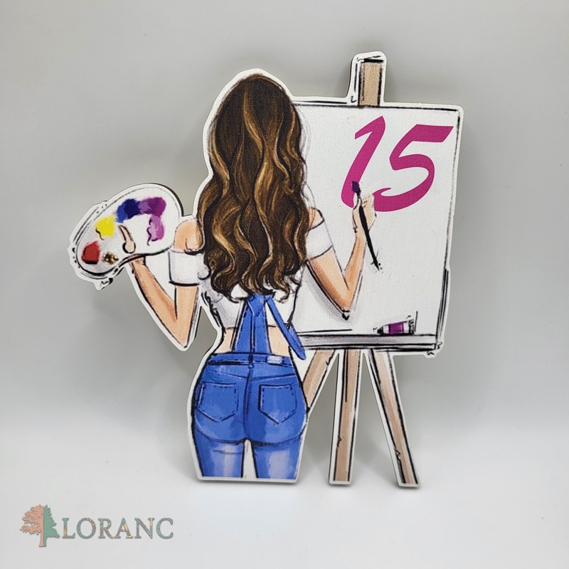 Drevená magnetka – maliarka s číslom 16 je originálna dekorácia vyrobená z kvalitnej topoľovej preglejky. Jemná ilustrácia dievčaťa pri maliarskom stojane s číslom 16 je ideálna ako dekorácia na tortu k 16. narodeninám, ale aj ako milá pamiatka po oslave.