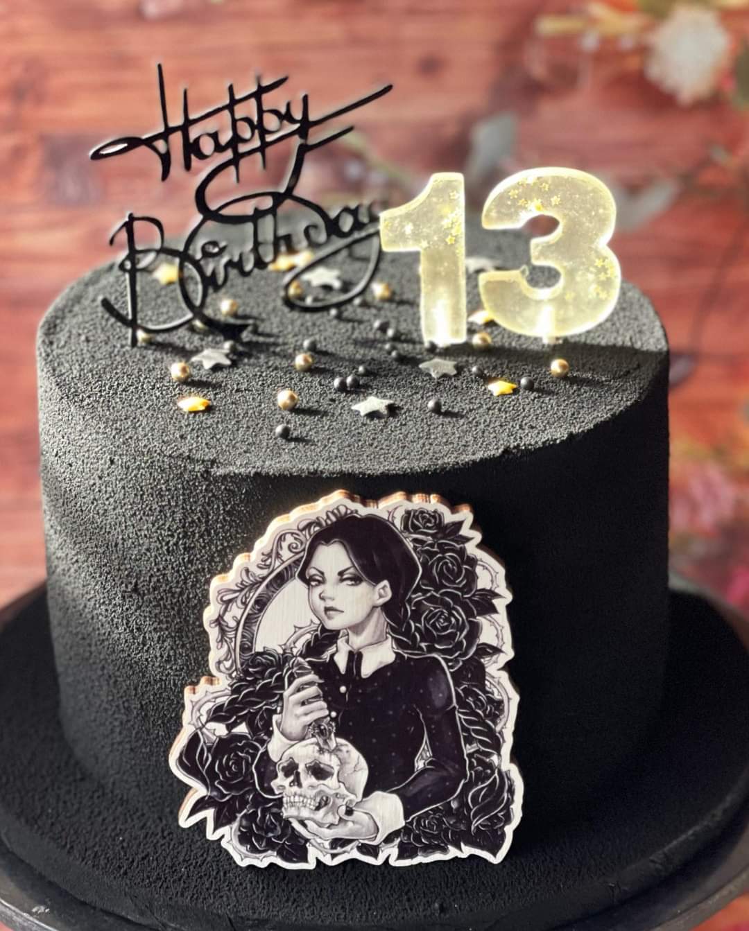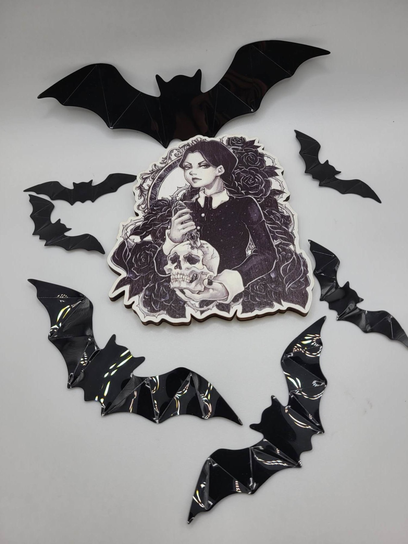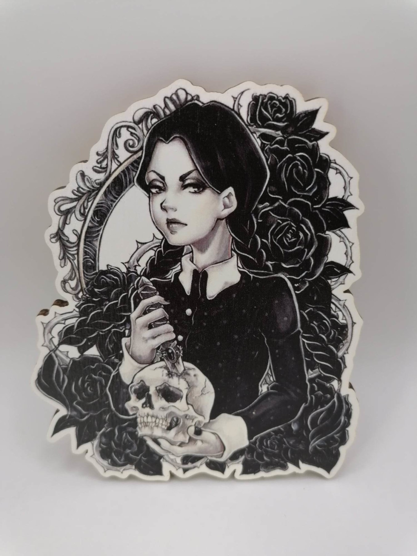 Drevená magnetka Wednesday je štýlová a originálna dekorácia na tortu, ideálna pre fanúšikov seriálu Wednesday. Skvelo sa hodí na narodeninovú tortu, tematickú oslavu či párty v gotickom alebo dark štýle. Magnetka je vhodná ako dekorácia na tortu – môžete ju umiestniť na čelo torty alebo si z nej jednoducho vytvoriť zápich na tortu. Stačí dozadu nalepiť špajglu a zápich na tortu je hotový.