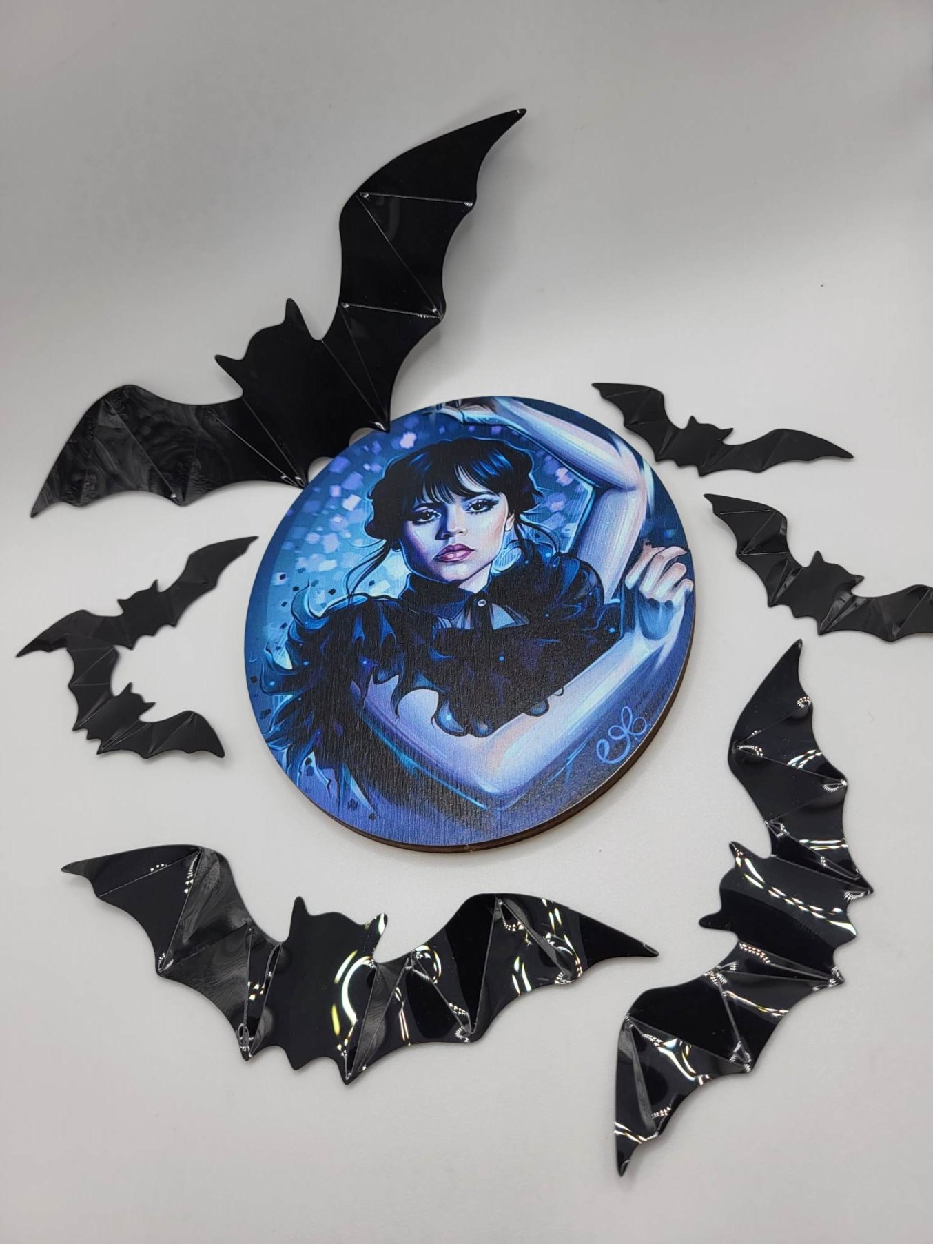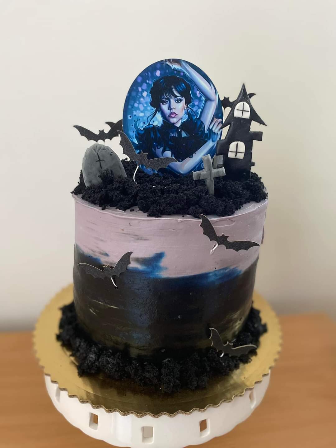 Drevená magnetka Wednesday je štýlová a originálna dekorácia na tortu, ideálna pre fanúšikov seriálu Wednesday. Skvelo sa hodí na narodeninovú tortu, tematickú oslavu či párty v gotickom alebo dark štýle. Magnetka je vhodná ako dekorácia na tortu – môžete ju umiestniť na čelo torty alebo si z nej jednoducho vytvoriť zápich na tortu. Stačí dozadu nalepiť špajglu a zápich na tortu je hotový.