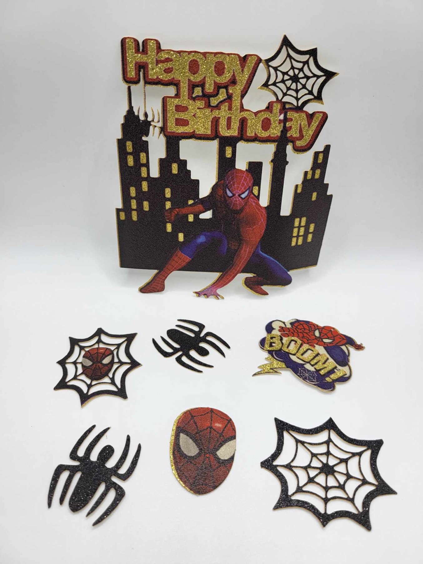 Hlavný topper Happy Birthday so siluetou mesta a akčnou pózou Spidermana pôsobí moderne, dynamicky a perfektne doplní torty pre chlapcov, fanúšikov Marvel sveta alebo komiksových hrdinov. Každý prvok je potlačený vo vysokej kvalite a glitrový povrch dodáva dekorácii nádherný lesk, ktorý vynikne najmä na fotkách.
