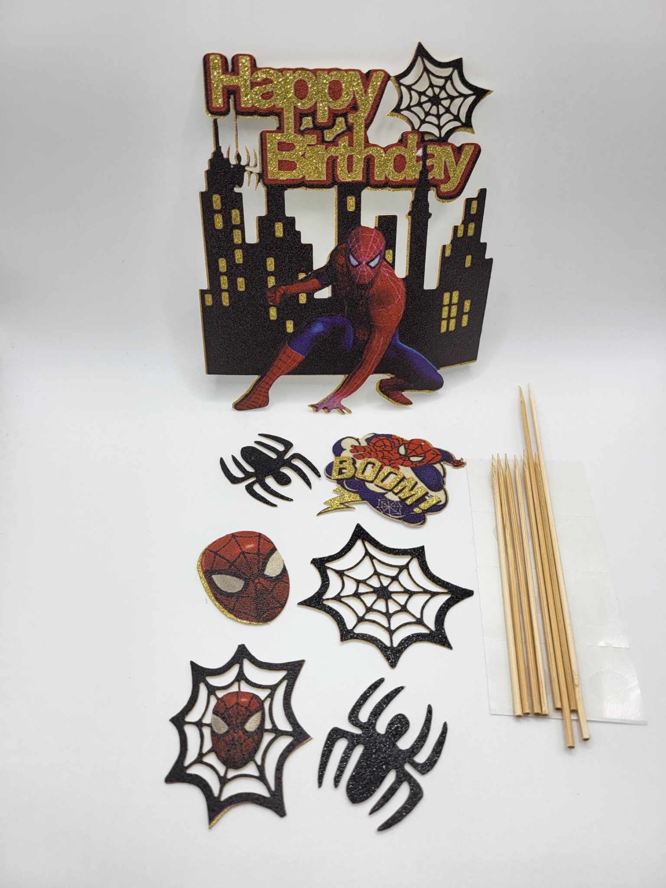 Papierový zápich na tortu so superhrdinom Spidermanom v prémiovom glitter prevedení je dokonalou voľbou pre všetky narodeninové oslavy v superhrdinskom štýle. Kombinácia čierneho lesklého papiera, zlatých detailov a výrazných komiksových prvkov vytvára luxusný a efektívny doplnok, ktorý okamžite upúta pozornosť. Súčasťou balenia je aj sada tematických dekorácií – pavučiny, pavúky, maska Spidermana či komiksové „BOOM!“ – vďaka ktorým môžeš tortu ozdobiť úplne podľa seba.