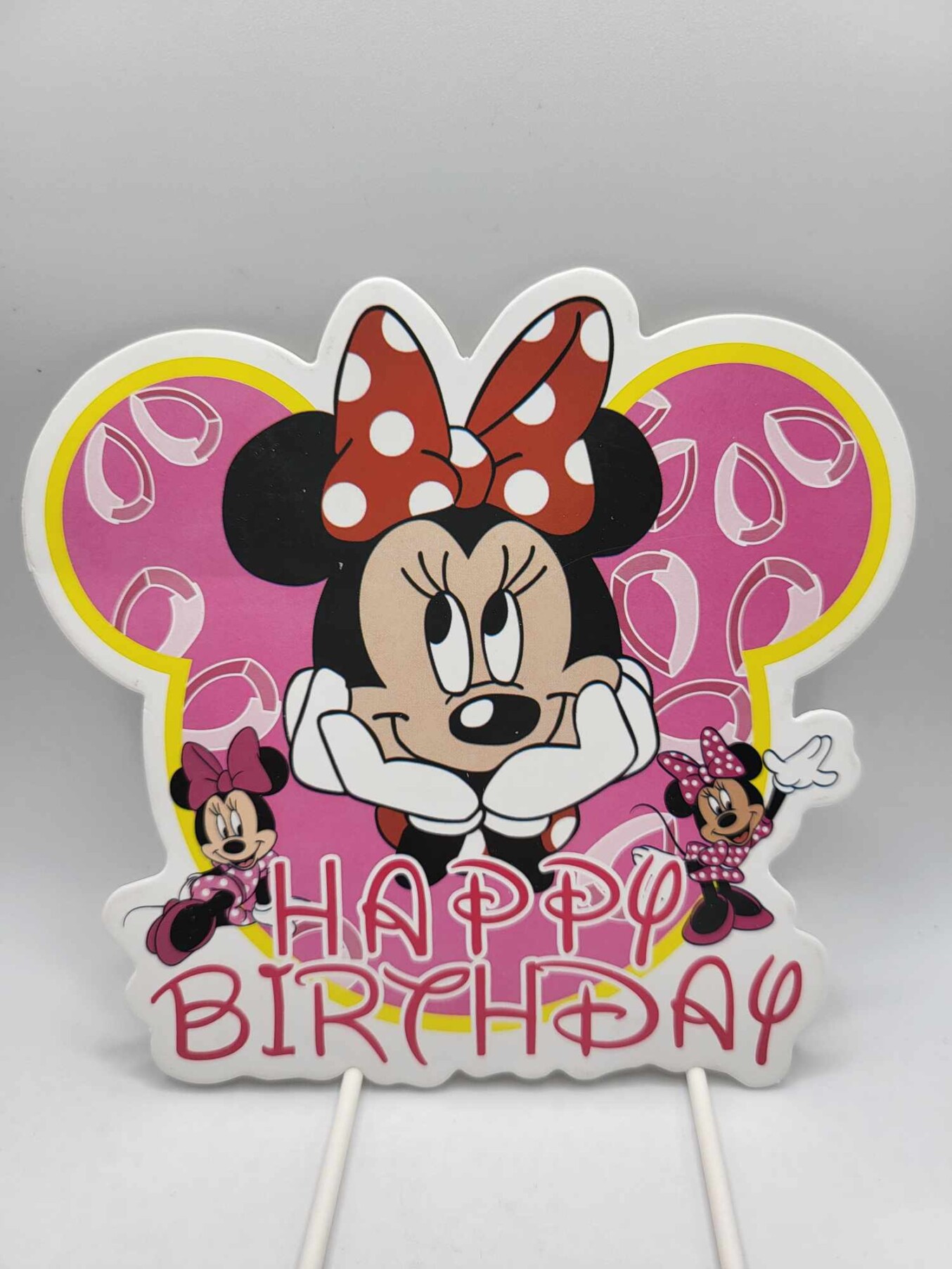Papierový zápich na tortu s veselým motívom Minnie Mouse je krásnym a výrazným doplnkom pre každú dievčenskú narodeninovú oslavu. Jemné ružové pozadie, kontrastná mašľa s bodkami a roztomilé ilustrácie Minnie vytvárajú sladkú, hravú a rozprávkovú atmosféru, ktorá dokonale oživí narodeninovú tortu.