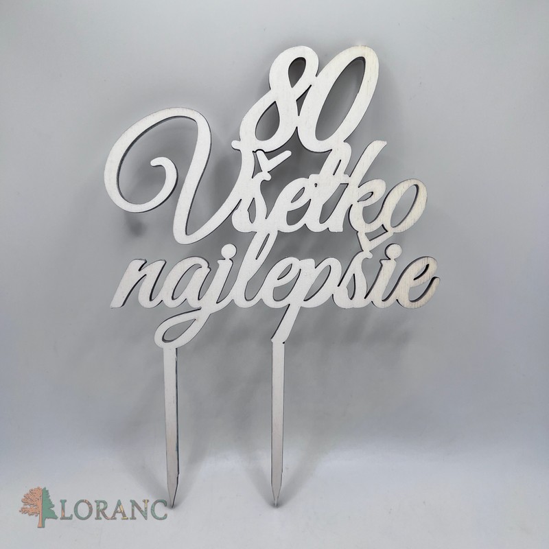 Drevený zápich na tortu „80 – Všetko najlepšie“ je elegantnou a nadčasovou dekoráciou, ktorá dodá narodeninovej torte výnimočný a slávnostný vzhľad. Vyrobený je z kvalitnej preglejky, ktorá je pevná, ľahká a esteticky pôsobí na každej torte – od maslových a smotanových až po fondánové.