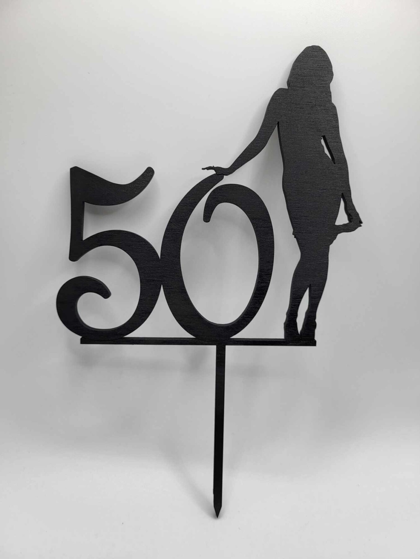 Elegantný drevený zápich s číslom 50 a siluetou ženy je štýlovou dekoráciou na oslavu okrúhlych narodenín. Moderný dizajn, čistá čierna farba a precízne vyrezané detaily pôsobia luxusne a perfektne doplnia narodeninovú tortu.