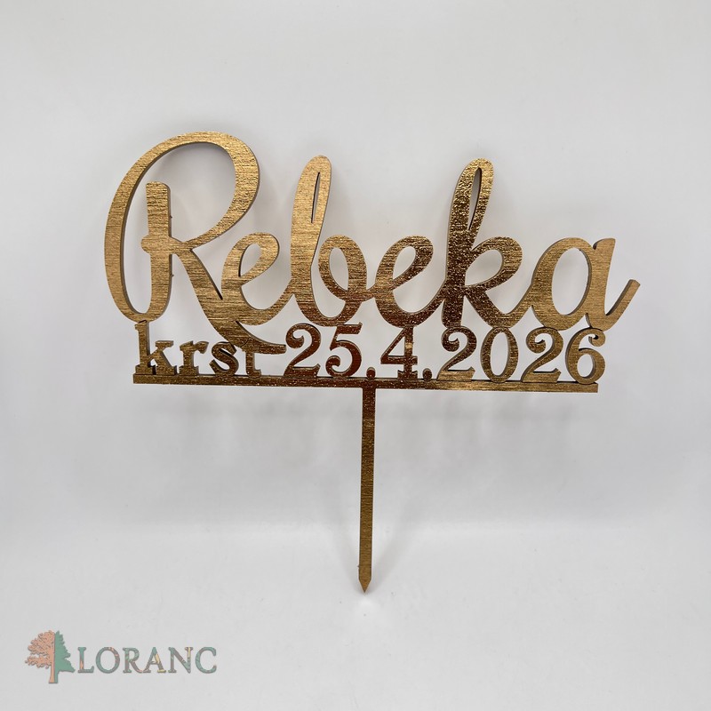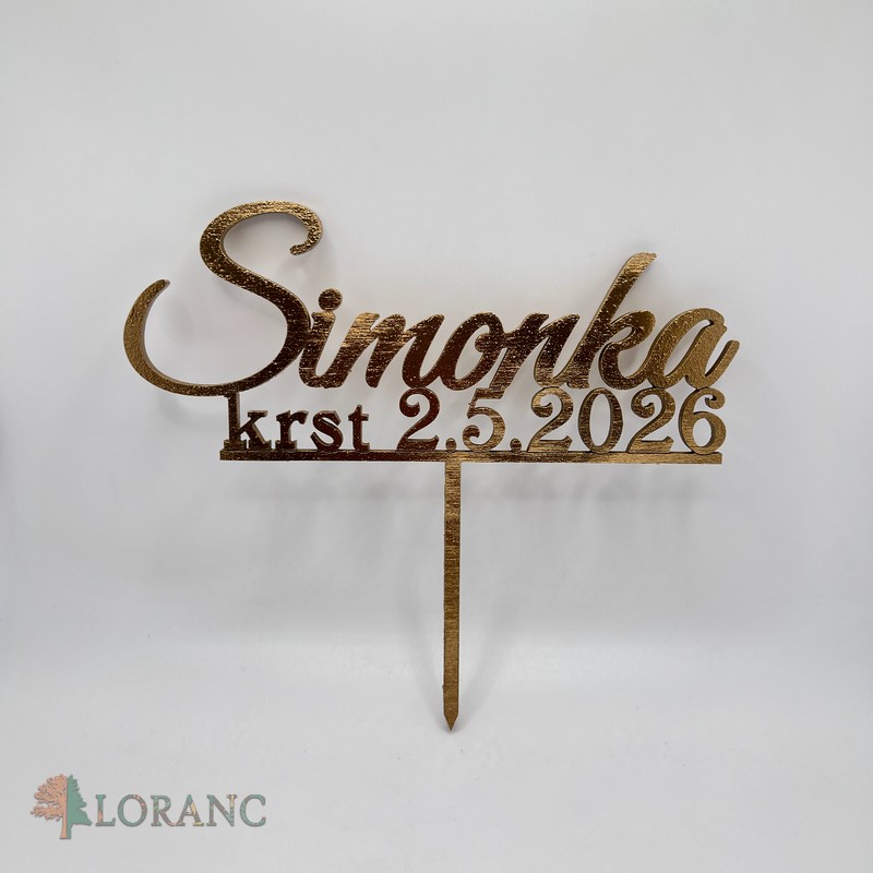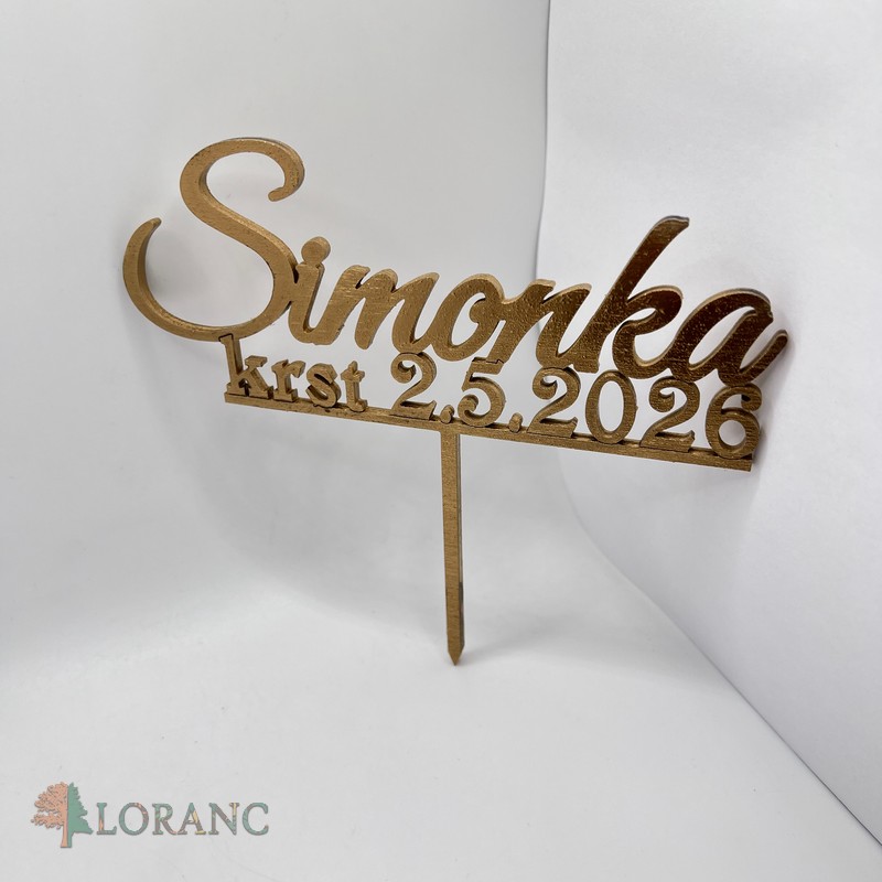 Drevený zápich na tortu – meno a dátum krstu v zlatej farbe | Personalizovaná dekorácia