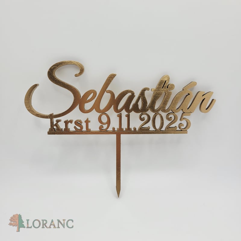 Luxusný drevený zápich na tortu s menom Sebastián a dátumom krstu 9.11.2025 je dokonalou dekoráciou na oslavu krstu. Vyrobený z kvalitnej drevenej preglejky a povrchovo upravený do elegantnej zlatej farby, ktorá dodá torte slávnostný a exkluzívny vzhľad.