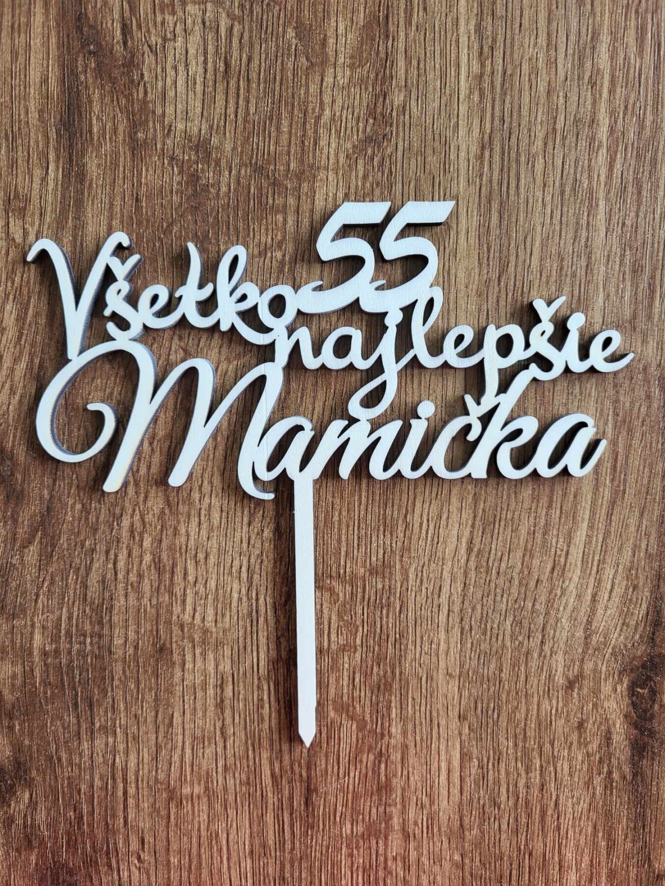 Elegantný drevený zápich na tortu – Všetko najlepšie mamička (55) je nádhernou ozdobou, ktorá dodá slávnostný a osobný dotyk každej narodeninovej torte. Zápich je vyrobený z kvalitnej preglejky, má precízne laserové vyrezávanie a čisté línie, ktoré pôsobia moderne a štýlovo.