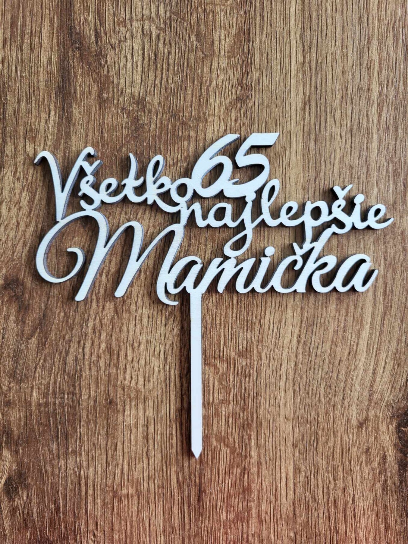 Elegantný drevený zápich na tortu – Všetko najlepšie mamička (65) je nádhernou ozdobou, ktorá dodá slávnostný a osobný dotyk každej narodeninovej torte. Zápich je vyrobený z kvalitnej preglejky, má precízne laserové vyrezávanie a čisté línie, ktoré pôsobia moderne a štýlovo.